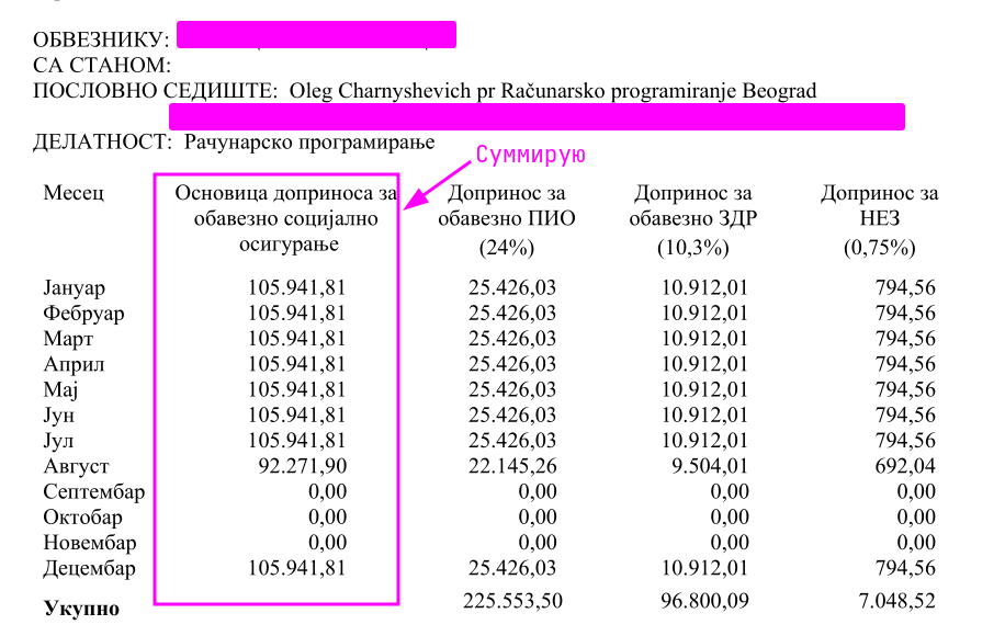 - (Если вы книгаш) Сумма доходов вашей компании за год который указан в пункте 2.5. Godina prihoda (см выше) в ДИНАРАХ с точностью до копейки. Сумма доходов за год определяется на основании данных бухгалтерского учета. Если у вас нет бух утчета, то вам нужно обратиться к бухгалтеру.