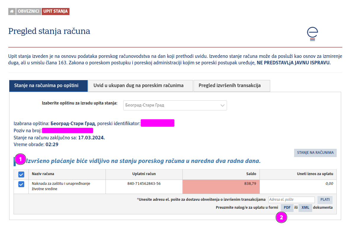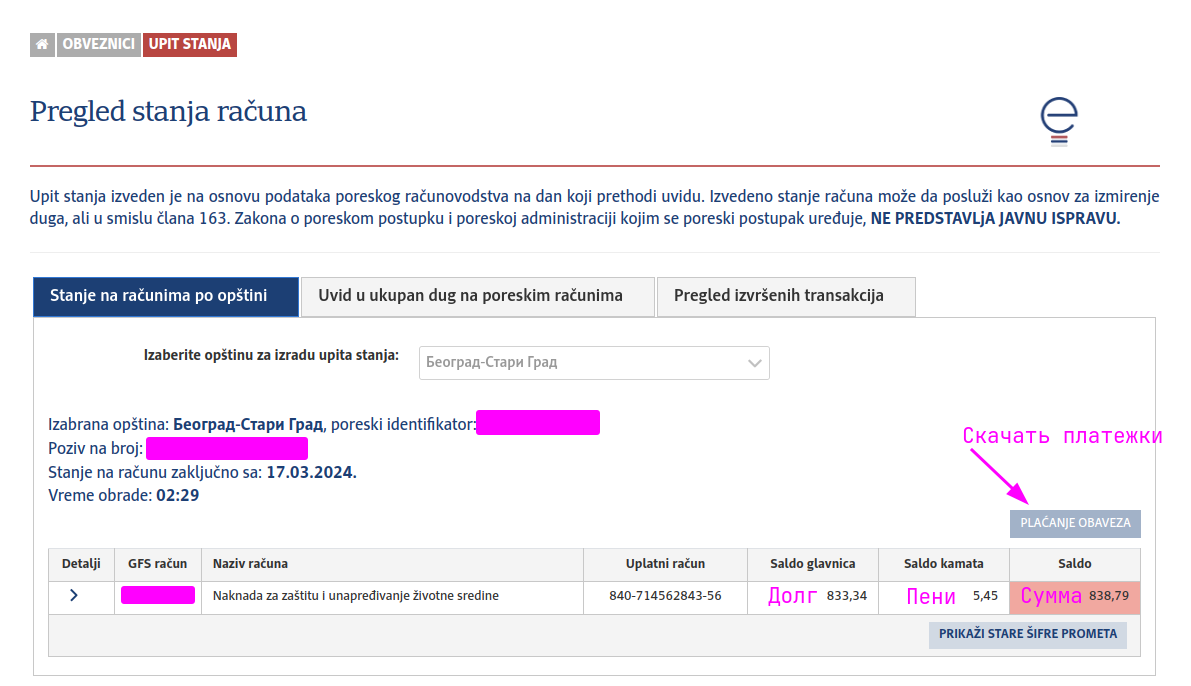 Saldoкрасная, то это значит задолжность. - Нажимайте на кнопку PLAĆANJE OBAVEZA и выбираете все счета с красными значениями при помощи чекбоксов.