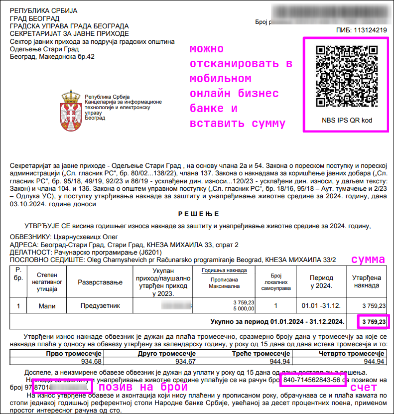 - Решение в котором указана сумма годового платежа и реквизиты для уплаты придет на юр адрес вашей компании, а также вы можете посмотреть все на портале lpa.gov.rs.