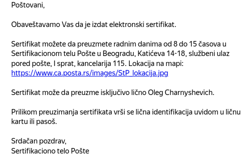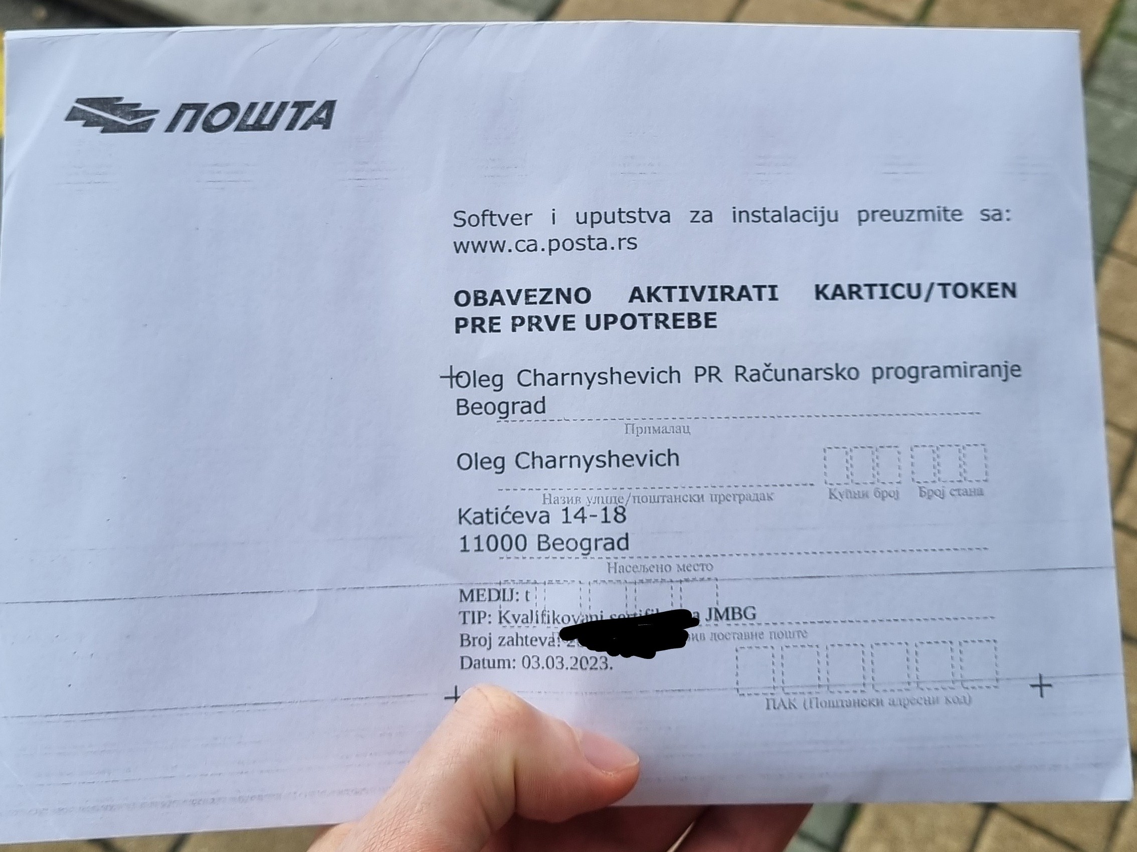 - В офф инструкции предлагается отправить заблокированную карточку и распечатанный и подписанный захтев почтой туда, где сертификат выдавался (ul. Katićeva 14-18, 11000 Beograd) и ждать ответного гудка