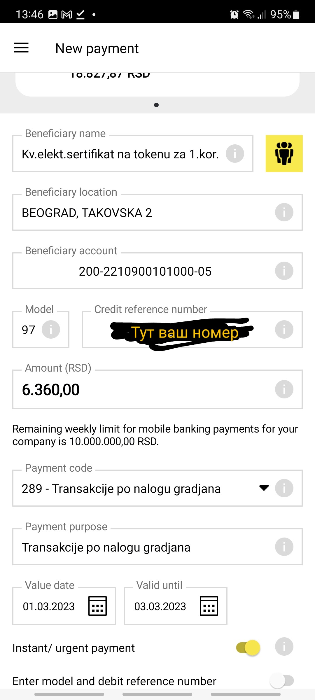 Поле Значение Beneficiary name или Naziv primaoca Как на скрине - Kv.elekt.sertifikat na tokenu za 1.kor.do 5.god. Beneficiary location или Mesto primaoca BEOGRAD, TAKOVSKA 2 Beneficiary account или Brok racuna primaoca Как на скрине выше - 200-2210900101000-05 Model 97 Credit reference number или Poziv na broj (odobrenje) Смотри пример выше, ваш номер начинается после цифр 97 Amount (RSD) или Iznos Сумма из чека. В моем случае 6360 Payment code или Sifra placanja 189 офлайн??? - не проверял 289 онлайн (если вы через приложение) Payment purpose или Svrha placanja Можно оставить как приложение подставило или написать своё После оплаты я ждал 2 рабочих дня и мне пришло письмо на электронную почту с приглашением прийти