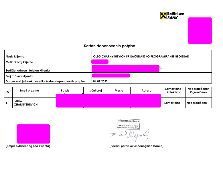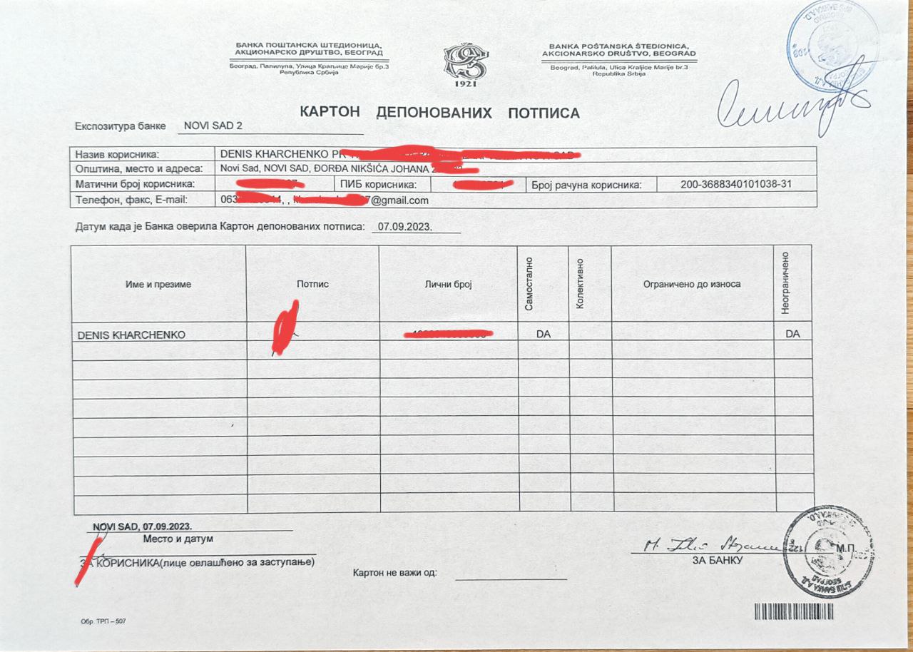 - После добавления номера ВНЖ к ИП, сходите в банк и уведомите об изменениях (придите с бумажкой из АПР и скажите что вы поменяли), если у вас счет в Поштанске или Райфе, то вам должны выдать новый kartona deponovanih potpisa (см ниже).