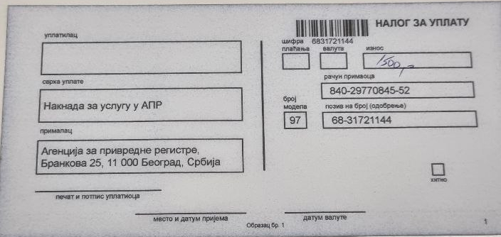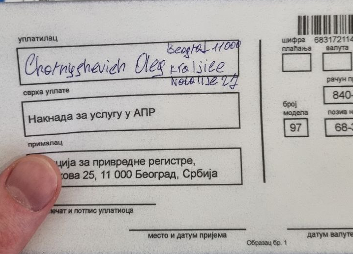 - Зашел в АПР пошел в окно информации, сказал что на переподачу и взял квитанцию на оплату пошлины 850 динар.