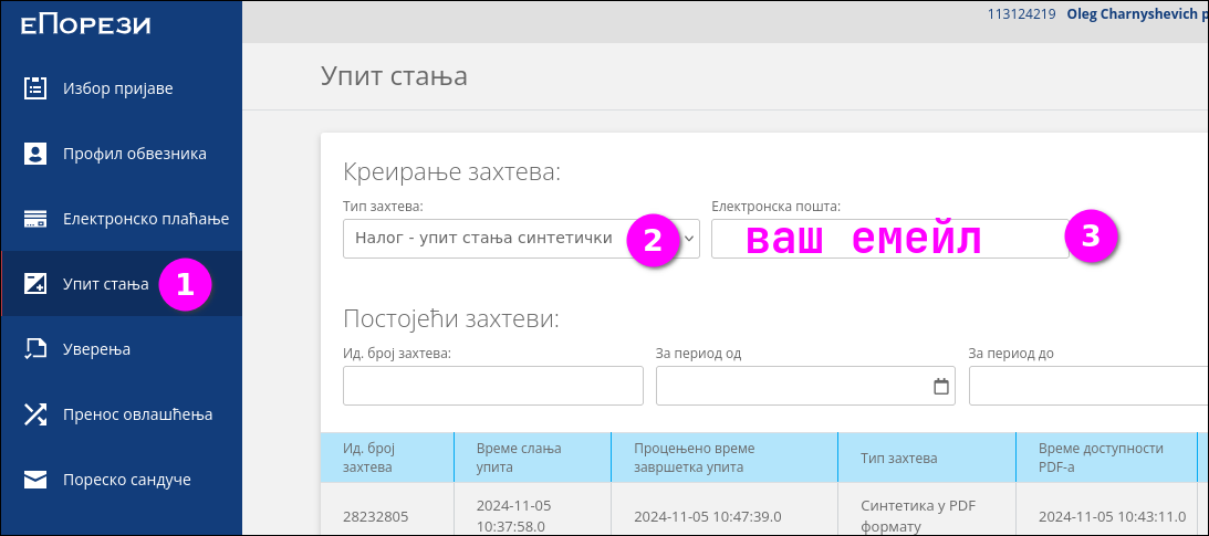 - Тип захтева:выбираете Налог - упит стања синтетички