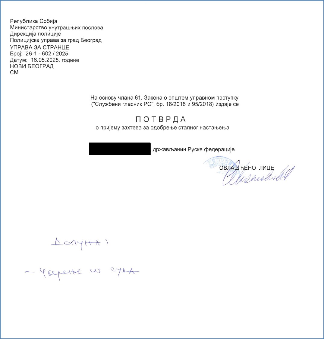 Интервью на сербском языке (можно прийти с переводчиком, человеком кто говорит по сербски), примерно 15-20 минут. В конце выдадут подтверду, подтверду нужно хранить до того как получите ПМЖ на случай если у вас кончится ВНЖ. Дальше ждать пока с вами свяжутся (скорее всего позвонят) и скажут что можно забирать ПМЖ. Так же инспектор с шансом 50-90% прийдет к вам домой и проверит что вы действительно живете по адресу, задаст пару вопросов. Некоторые инспекторы могут позвонить за 15 минут до прихода, предупредит.