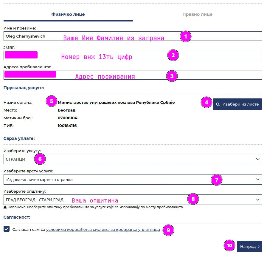 - НЕЛЬЗЯ указывать чужой JMBG (номер ВНЖ 13ть цифр), это номер должен быть ТОГО ЧЕЛОВЕКА за которого платите, если у человека его нет, то этот метод оплаты НЕ ПОДХОДИТ.