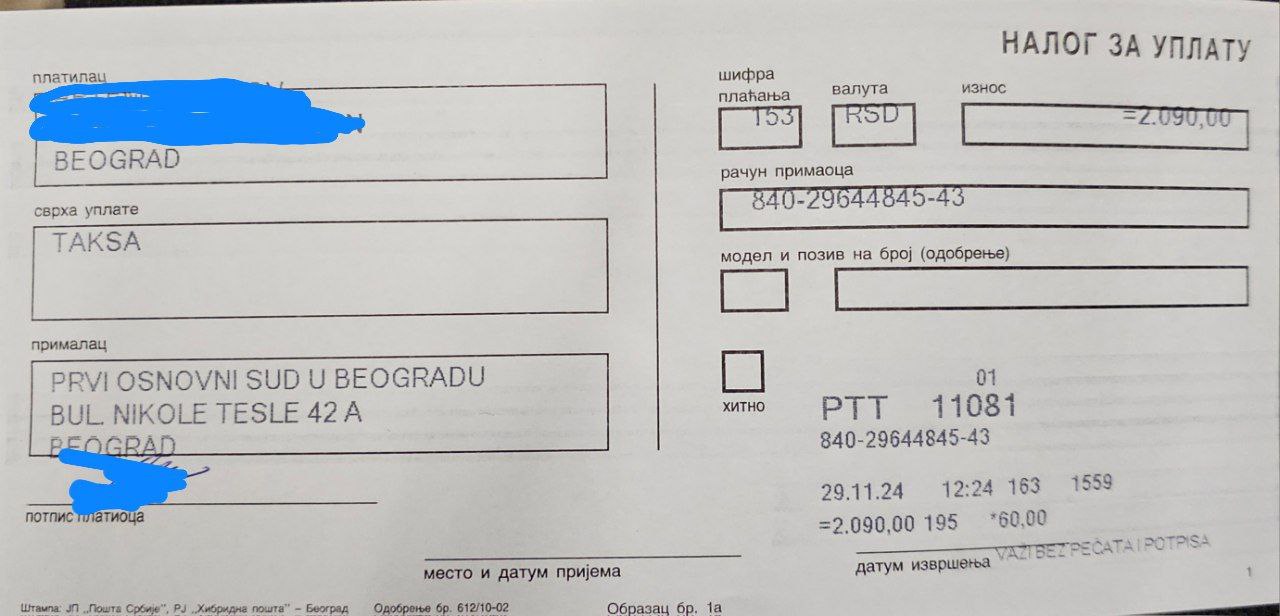 - Bulevar Nikole Tesle 42, Нови Београд - 18 кабинет. График работы Пн-Пт с 8:00 до 15:00. Перерыв с 10:00 до 10:30. Оплата пошлины в отделение почты находящиеся в этом же здании суда, в холле.