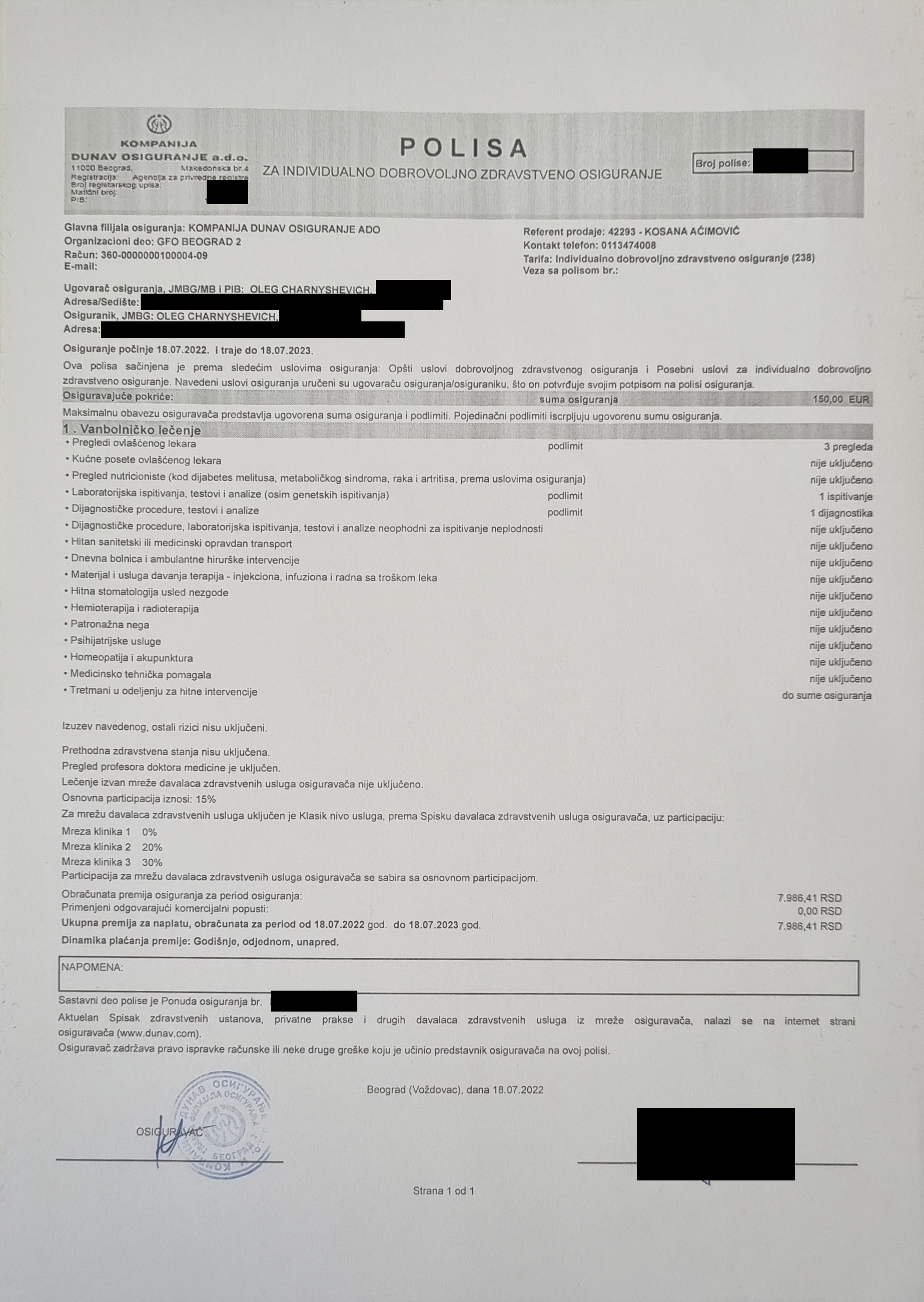 Дунав осигуранье это частная страховая компания. Эта страховка часто используется только для ВНЖ так как покрытие у неё минимальное.
