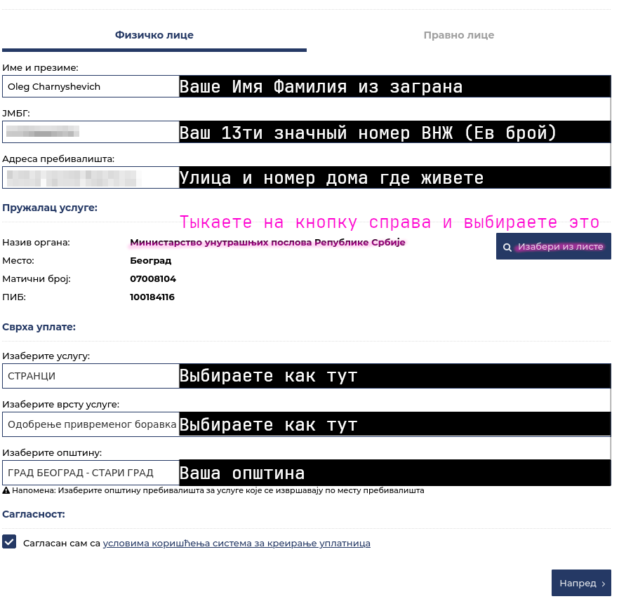 - Уплата гос.пошлин за получение ВНЖ для граждан РФ (22.700+420 RSD) за внж + (1.788+2.120 RSD) за биометрию