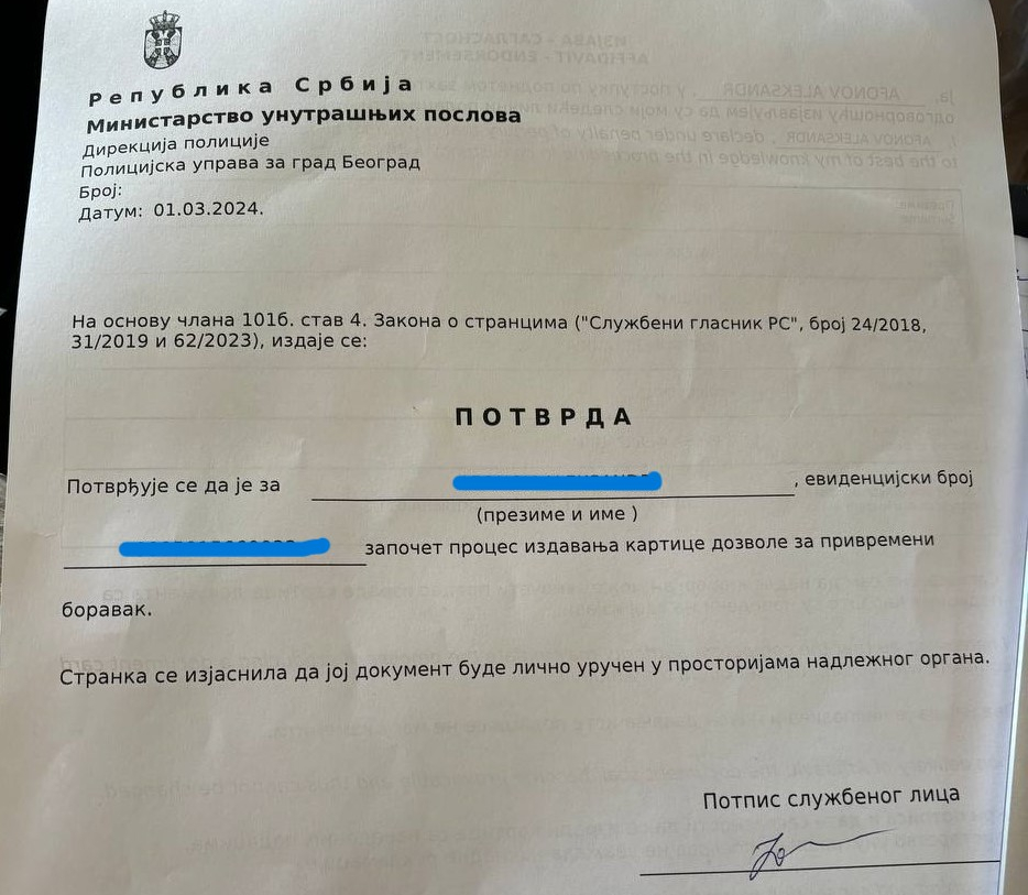 - После личной подачи документов на ВНЖ в МУП (Министарство унутрашњих послова Републике Србије).